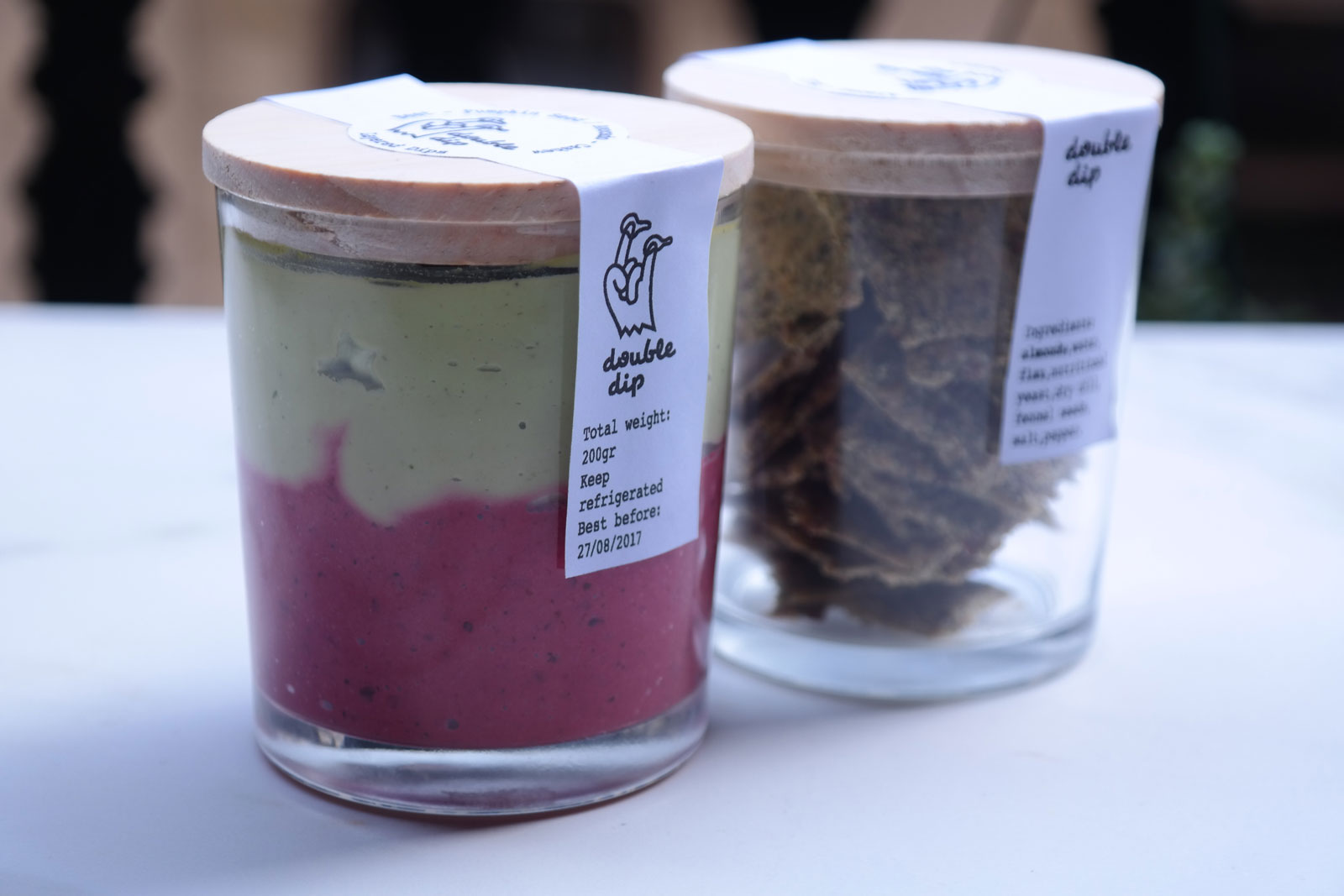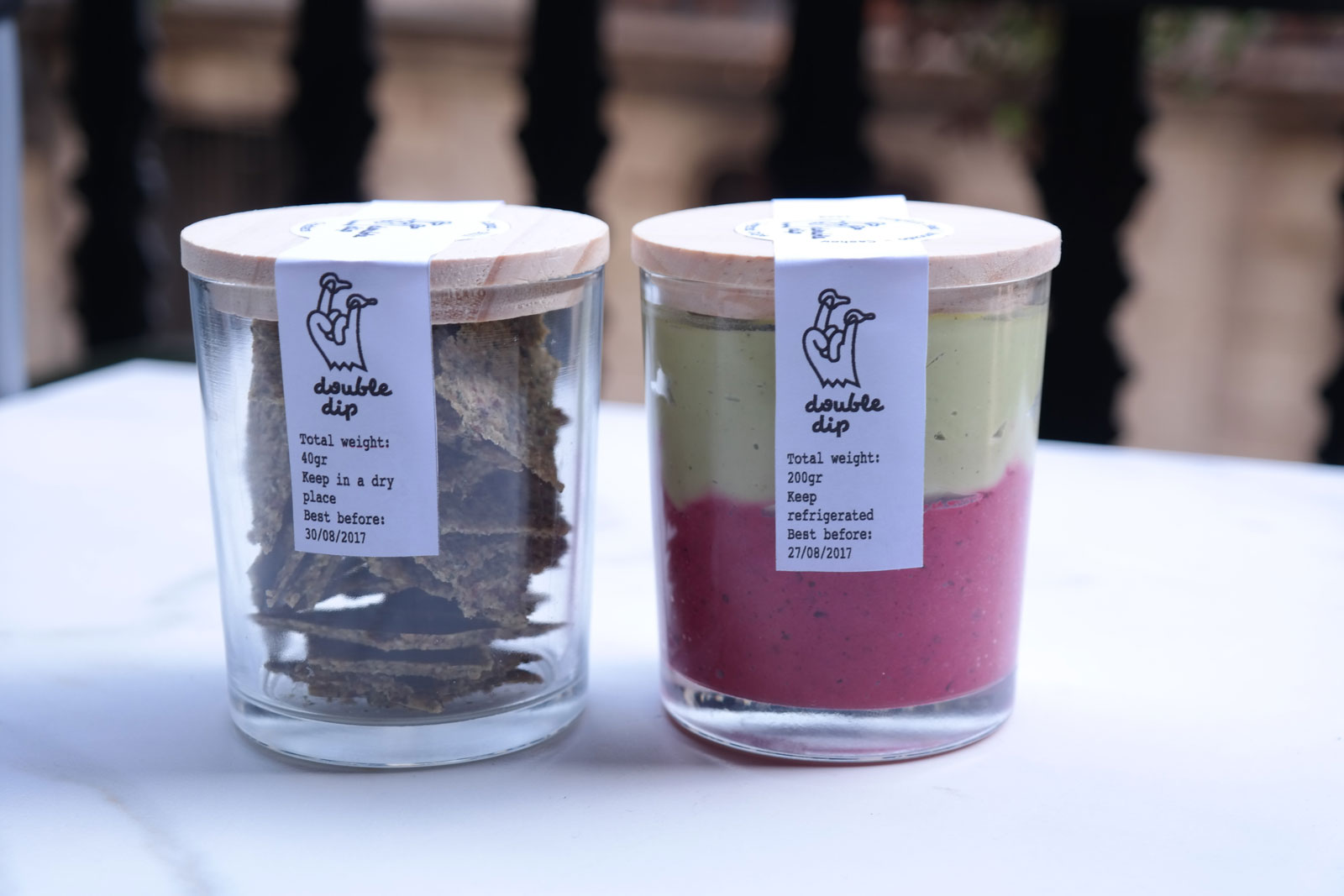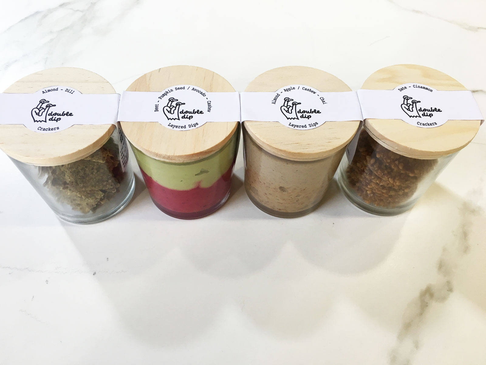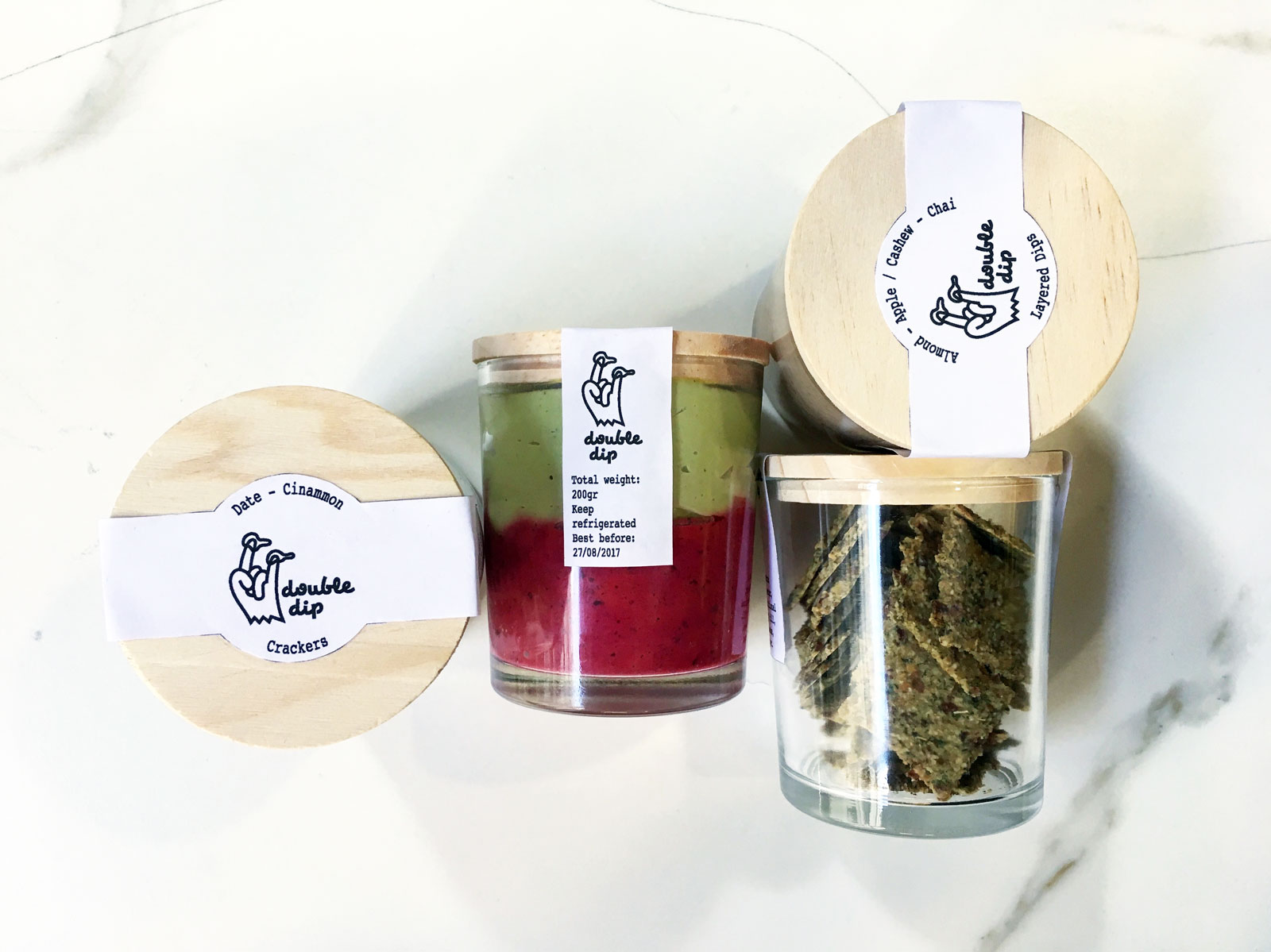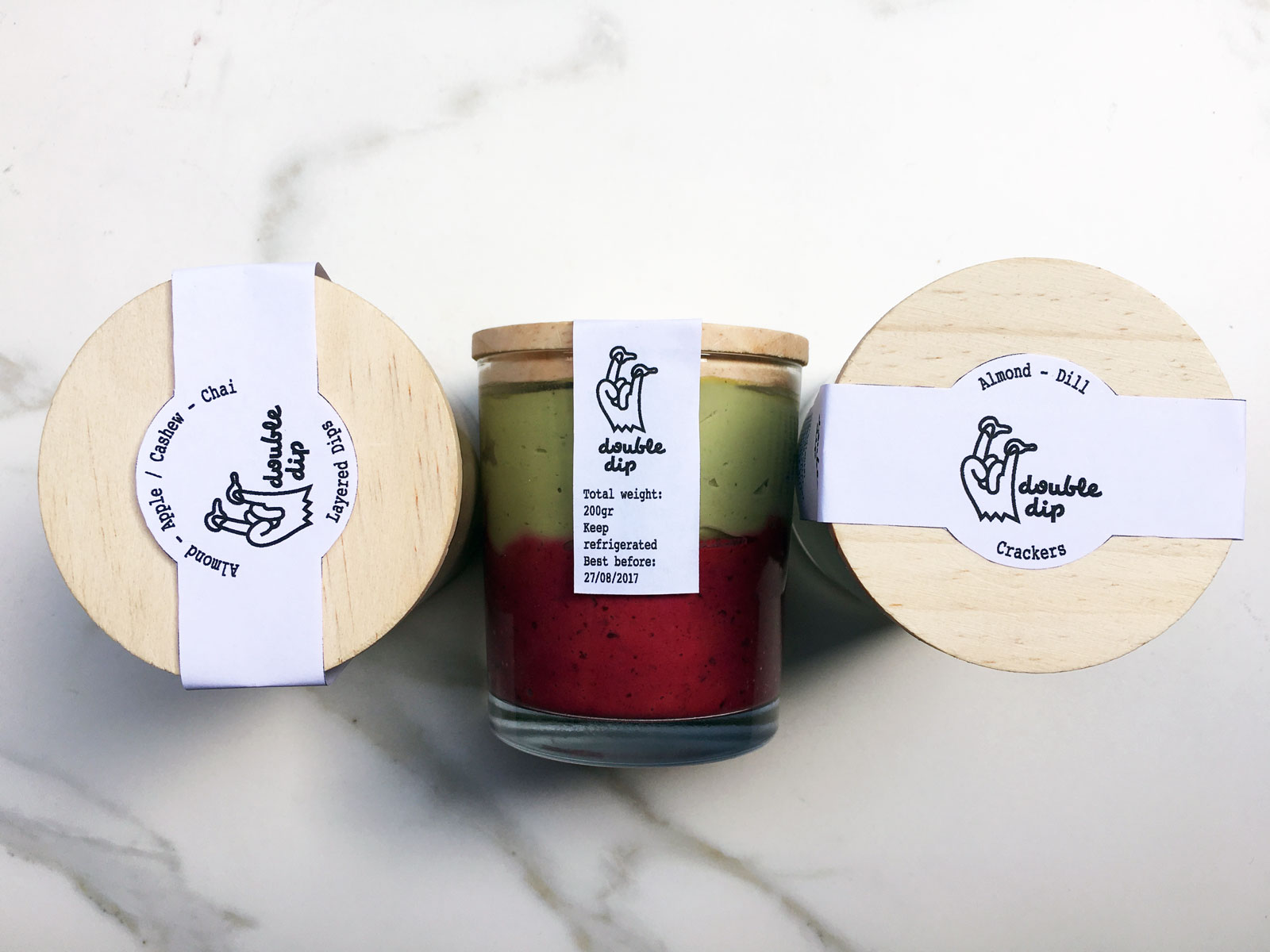 “Double Dip” is a duo of layered sweet and savory dips accompanied by their crackers. Packaged in individual glass containers, they are a fun suggestion for serving and eating a light meal on the go. The name suggests a gesture you are not supposed to do when cooking or sharing food but you actually want to do it if something is super delicious!